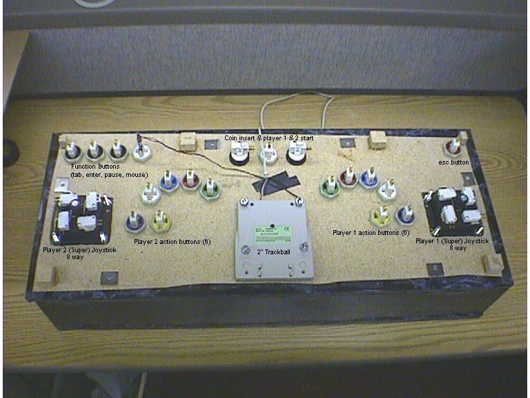 I decided to go with two 8 way Happs Super joysticks with 6 Happs competition pushbuttons per person. For the trackball I bought a digital research 2" trackball at Best Buy. In my initial design I didn't have a spinner included, but I later used the build your own spinner instructions from Twisty Grip to build my spinner and added that on after the joystick was done which you can see in this picture.